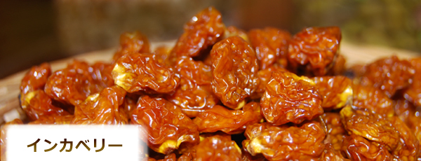 インカベリー (別名:ゴールデンベリー 学名:Physalis) は「西洋ほおずき」と訳され、日本のほおずきと形は似ていますが、成分が異なります。口に含むとまず爽やかな酸味、つぎに濃厚な甘みがやってくる、ユニークなドライフルーツです。南米の標高の高い地域で育てられ、当地の民間薬として数百年にわたり愛されてきました。抗酸化物質や食物繊維が大変多く含まれており、「健康効果と同時においしさも妥協できない」という方に最適な食品です。